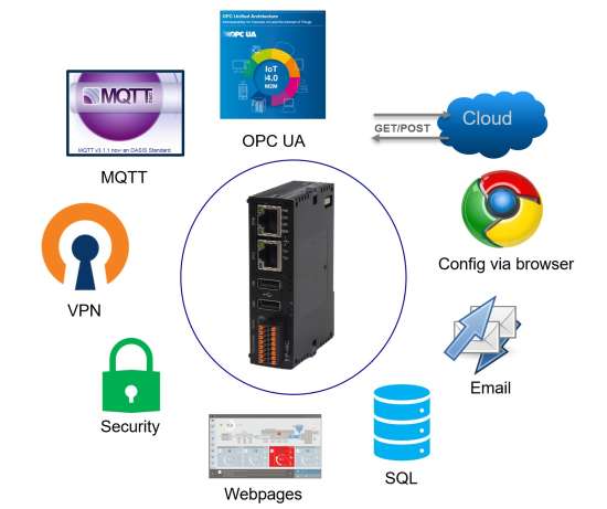 TCP/IP, UDP/IP, DHCP, FTP, FTPS, SSH, HTTP, HTTPS; SMTP, ESMTP-Auth, POP3; NTP, Modbus, DNS, SNMP, VPN, VNC, MQTT, SQL, OPC UA