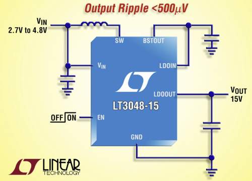 Linear Technology/Analog Devices’ LT3048 is dual step-up/boost switching regulator and low dropout (LDO) regulator. This device generates low noise, low ripple bias output from input voltages of 2.7 V to 4.8 V. The boost regulator provides power to the linear regulator, and its output voltage is regulated to 1.1 V above the LDO output, optimizing LDO ripple rejection and transient response. Fixed frequency operation and current mode control allow the use of very small inductors and results in low, predictable output ripple. The switching regulator puts out minimum of 300 mA of current at 4.4 V, 6.1 V, 13.1 V, 16.1 V, and 23.1 V. The linear regulator generates 45 mA of current with a programmable voltage up to 22 V or fixed voltages of 3.3 V, 5 V, 12 V, and 15 V. High power supply ripple rejection combined with a low noise internal reference results in less than 500 μVP-P output ripple and noise. The LT3048 is perfect for op amp power supplies and sensor biasing applications.