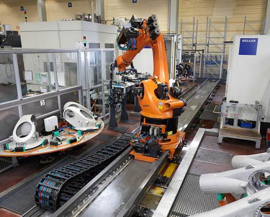 Numerous practical examples prove already how efficient and highly productive smart production can be. Example of Kuka: Kuka connects the analog and digital worlds in the manufacture of robot components in a fully automated, networked cell. The cell shows how a robot produces robot components in collaboration with two machining centers. A six-axis robot takes over handling of the cast components. With its work area extended over a linear unit, it can operate both machining centers and additionally perform deburring work. Insofar, this is the analog world.