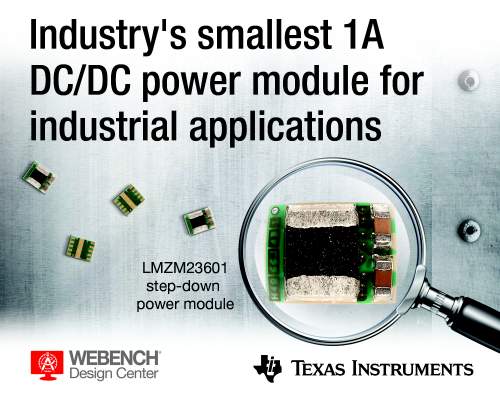 Texas Instruments introduced two new 4-V to 36-V power modules that measure just 3.0 mm by 3.8 mm and require only two external components for operation. The 0.5-A LMZM23600 and 1-A LMZM23601 DC/DC step-down converters achieve up to 92 percent efficiency, which minimizes energy loss, and feature tiny MicroSiP™ packaging that shrinks board space by up to 58 percent. The converters expand TI's power module portfolio to address up to 1-A performance-driven, space-constrained communication and industrial designs, including field transmitters, ultrasound scanners and network security cameras. For more information, samples and evaluation modules, see ti.com/lmzm23601.