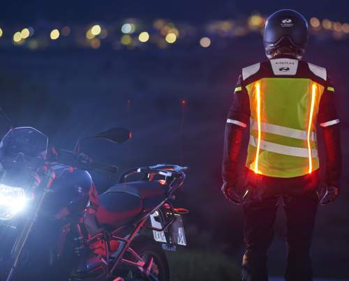 Passive protection in the form of reflector strips in clothing, for example, generally does not suffice on the roads during darkness and when visibility is poor. Jackets with integrated lighting, on the other hand, do not require incident light from vehicle headlights or street lamps, rather offer active protection.The Osram light modules, which are specially developed for two of Held's jackets and a safety vest, can be switched on easily before heading out on the motorbike by simply connecting a rechargeable battery pack. With no need for other manual settings, the light strips offer up to seven hours of active lighting in continuous operation (with a 4,000 mAh battery) with the LED light modules emitting white light at the front and red light at the back. The light modules can be integrated quickly and simply by the rider into the clothing through a fabric tube, and the battery charged with ease via a USB port.