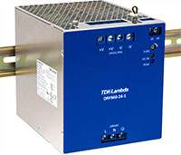 TDK Corporation's DRF series of AC-DC DIN rail mount power supplies now includes a 960 W rated model. The high 95% efficiency produces less internal waste heat, enabling electrolytic capacitors to run cooler, which provides a calculated life of in excess of eleven years with a 75% load at 230 VAC input. The unit can supply a peak load of 1440 W (24 V, 60 A) for up to 4 seconds to power capacitive and inductive loads. Applications include industrial process control, factory automation, and test and measurement equipment.