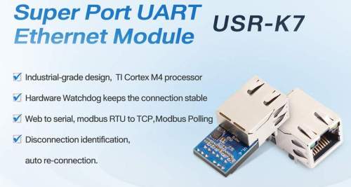 The most interesting product, from our standpoint, is probably the USR-K7 module, also known as SuperPort. It is an industrial grade TI Cortex M4 MCU based Serial to Ethernet module with a rich set of features.
