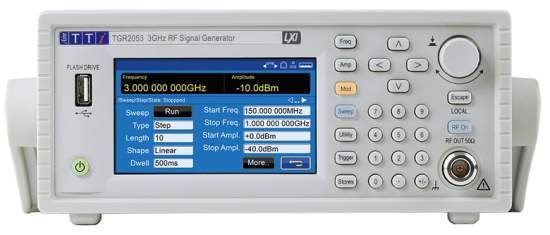 The Aim-TTi TGR2050 Series comprises two models — the TGR2051 and TGR2053 — with output frequency ranges from 150kHz up to 1.5GHz and 3GHz, respectively. Both models offer 1ppm frequency accuracy, frequency stability to within 1ppm drift over the first year, and phase noise less than –117dBc/Hz (typical) at 1GHz output and 10kHz offset. Output amplitude range is from –127dBm to +13dBm, with setting resolution of 0.1dBm.