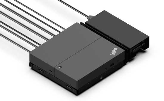 The ThinkSmart dock is equipped with a vast array of ports, next-gen plug-and-play functionality, rapid charging capabilities2, and is powerful enough to install critical firmware updates automatically. The ThinkSmart dock features an innovative cable management system that keeps all cables out of the way and locked down to prevent accidental unplugging. This allows for meeting attendees to quickly plug-in their laptops using a single, tidy cord.
