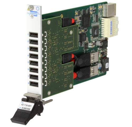USB 2.0 Hub (model 42-738) is a single-slot 3U PXIe module that combines an 8-port USB 2.0 hub and USB data/power switching to provide a controlled connection between the backplane and USB products. Each port can connect and disconnect the power and data paths separately, simulating various connection faults.