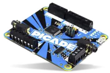 The Pimoroni Picade PCB is an Arduino-compatible board with an integrated 3W stereo amplifier. The Picade is designed for use in arcade projects and behaves like a keyboard when plugged in via USB. The Picade has default key-mapping but can be reprogramed using the Arduino IDE. Connections are made using screw terminals for a solid, permanent installation. The board uses the ATmega32U4, the same microcontroller as the Arduino Leonardo, and is pre-installed with the Arduino bootloader and Pimoroni's software.