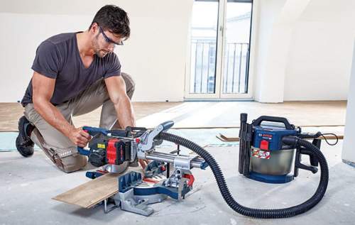 Ukośnica GCM 18V-216 posiada również system odsysania pyłu z możliwością podłączenia odkurzacza, co zapewnia efektywne pochłanianie pyłu. Produkt w wyposażeniu posiada również worek zbierający pył w trakcie pracy. Idealnie wyśrodkowane szyny umożliwiają z kolei płynne i łatwe przesuwanie urządzenia.